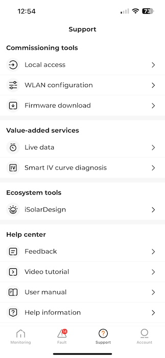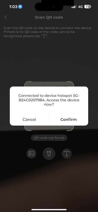 On the WLAN screen it will open a camera to scan a QR code. As you have directly connected to the inverter wifi already, you will be prompted to confirm the connection to the inverter instead.